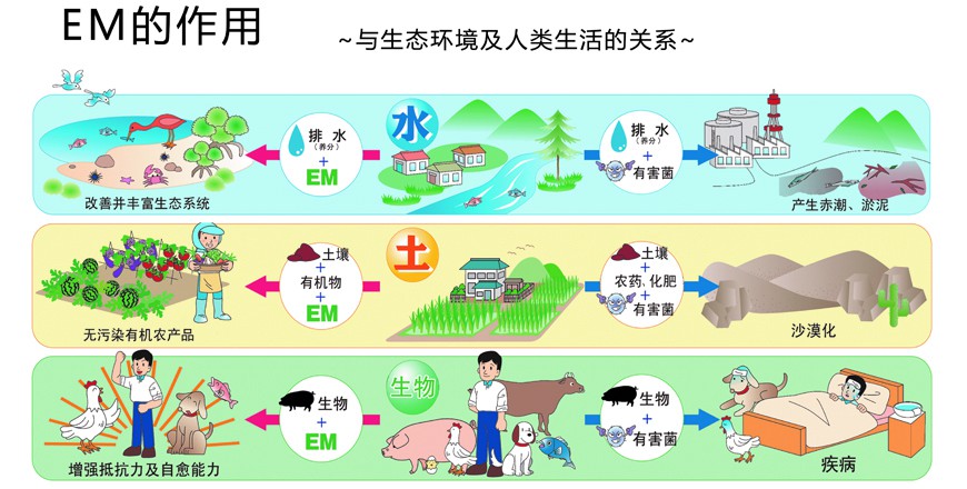 EM是日本琉球大學(xué)比嘉照夫教授發(fā)明的有效微生物群技術(shù)及產(chǎn)品,它由光合菌類、乳酸菌類、酵母菌類等三大菌群的多屬多種微生物組成。