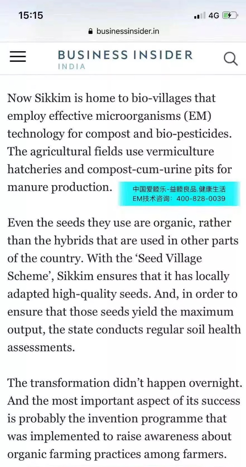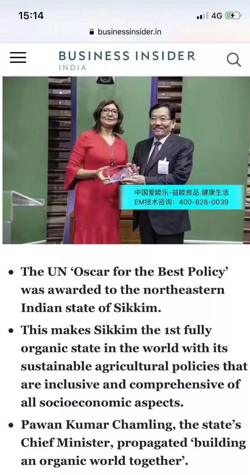 聯(lián)合國最優(yōu)秀政策奧斯卡獎授給利用EM(有用微生物群)技術建設的有機健康印度シッキム州。